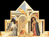 L'Annonciation faite à Marie par l'archange Gabriel, est décrite dans le seul Évangile de Luc et d'une façon très détaillée dans La Légende dorée de Jacques de Voragine, l'ouvrage de référence des peintres de la Renaissance, qui permet de la représenter dans toute sa symbolique (jardin clos, colonnade, chambre et lit de la maison de Marie, son livre, présence du Saint-Esprit, évocation d'Adam et Ève chassés du Paradis après avoir désobéi à Dieu).