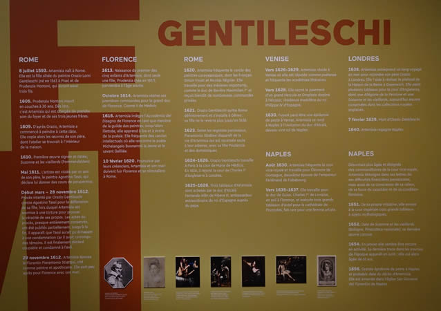 Née en 1593 à Rome, Artemisia connaît une renommée internationale importante, auprès des grandes cours européennes notamment. À l'instar de son père Orazio Gentileschi, elle reçoit de prestigieuses commandes de la part de puissants mécènes, tels que Cosme Il de Médicis, le duc de Bavière ou Philippe IV d'Espagne. Après un passage à la cour de France où il participe à la décoration du palais du Luxembourg, Orazio est nommé en 1626 peintre du roi Charles 1er d'Angleterre. Les deux artistes ne se retrouveront qu'en 1638 à Londres, au fil de leurs brillantes carrières parallèles, marquées par l'élaboration d'un style élégant qui connut un large succès et que reflètent les peintures présentées dans cette salle.
