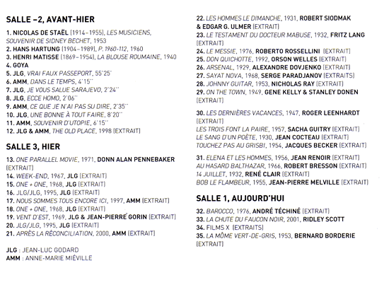 Cette salle où le spectateur inattentif pénètre en premier est la plus séduisante. Un jardin de plantes vertes et des chaises longues en constitue le centre. A la périphérie, des écrans plats diffusent des chefs-d'uvre du septième art. Ce sont, tous des films que Godard à déjà cité dans ses films ou ses critiques : Un jour à New York (Stanley Donen, 1949) Johnny Guitare (Nicholas Ray,1953) Sayat Nova, (Serge Paradjanov,1968) Arsenal (Alexandre Dovjenko, 1929), Au hasard Balthazar (Robert Bresson,1966) Bob le flambeur (Jean-Pierre Melville,1955), Les Dernières Vacances (Roger Leenhardt,1947) Don Quichotte (Orson Welles), Elena et les hommes (Jean Renoir,1956) Les hommes le dimanche (Robert Siodmak, 1931), 14 juillet (René Clair, 1932) Touchez pas au grisbi (Jacques Becker,1954), Les Trois font la paire (Sacha Guitry,1957).