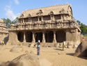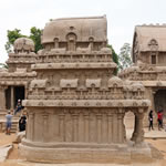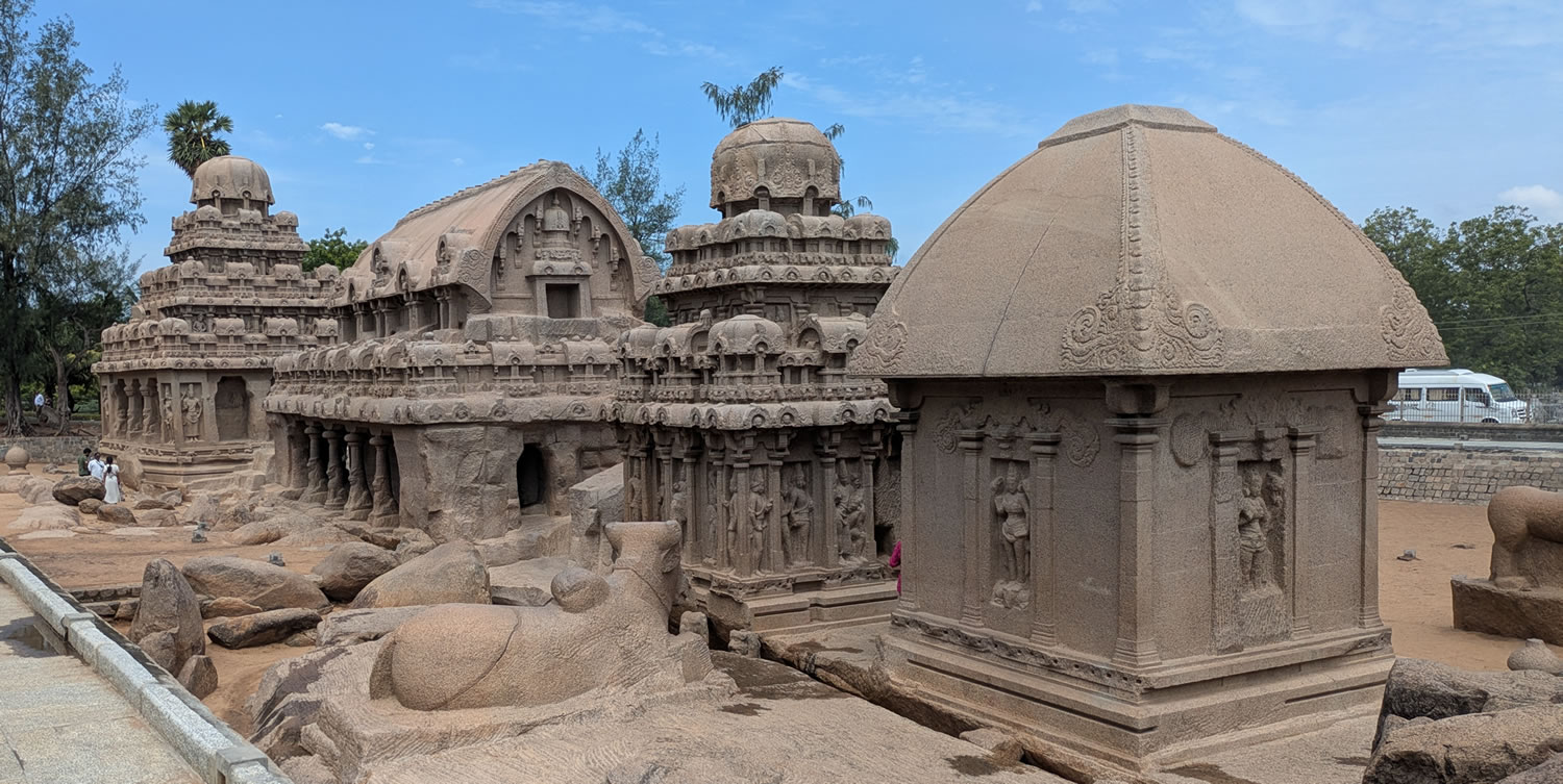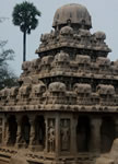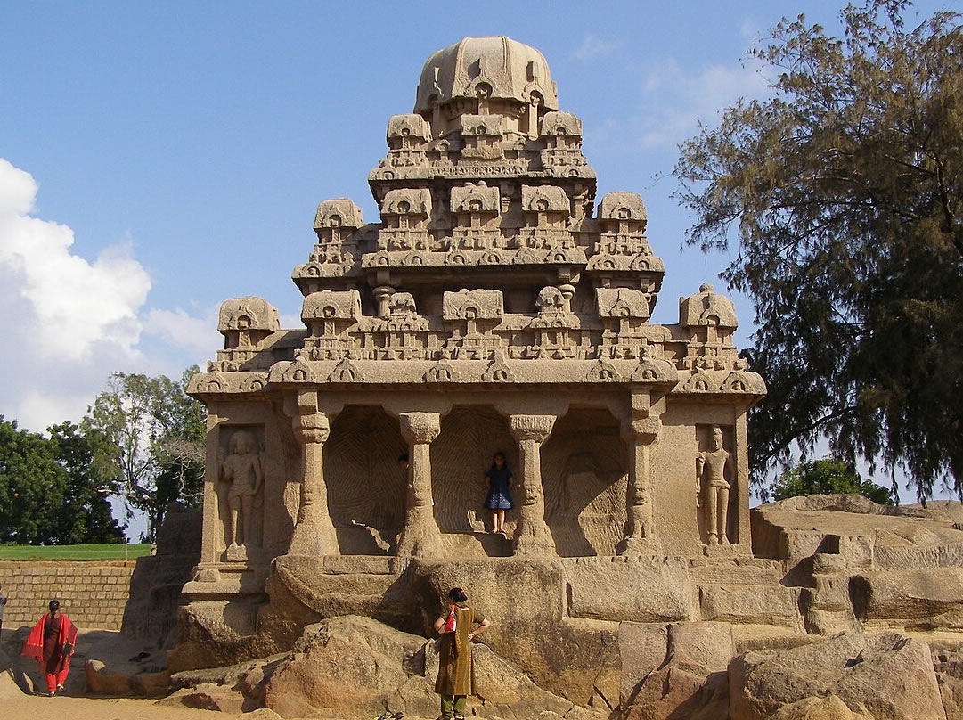 La capitale de la dynastie des Pallava était Kanchipuram, mais une grande part de leurs fondations religieuses et réalisations artistiques se trouvent dans leur principal port, Mahabalipuram, dont le nom ancien était Mahāmallapuram, d'après un des titres du roi Narasimhavarman It (r. vers 630- 668). On attribue à ce souverain un grand nombre de temples rupestres, c'est-à-dire des grottes, mais aussi un ensemble de cinq sanctuaires qui paraissent construits bien qu'ils soient en réalité entièrement sculptés à partir d'un immense bloc de pierre.