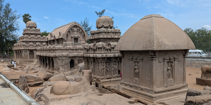Les trois autres temples n'ont pas connu une pareille postérité, si ce n'est, justement, sous la forme des édicules ornant les superstructures : le ratha de Bhima adopte un plan oblong ouvert sur quatre côtés avec un péristyle entourant une cella allongée, dont le dégagement n'a pas été terminé, et une toiture en carène; le ratha de Draupadi a la forme d'une hutte villageoise, avec un toit à quatre pans imitant les toits de chaume; enfin, le ratha de Nakula et Sahadeva, décentré par rapport aux quatre autres, a un plan en abside.