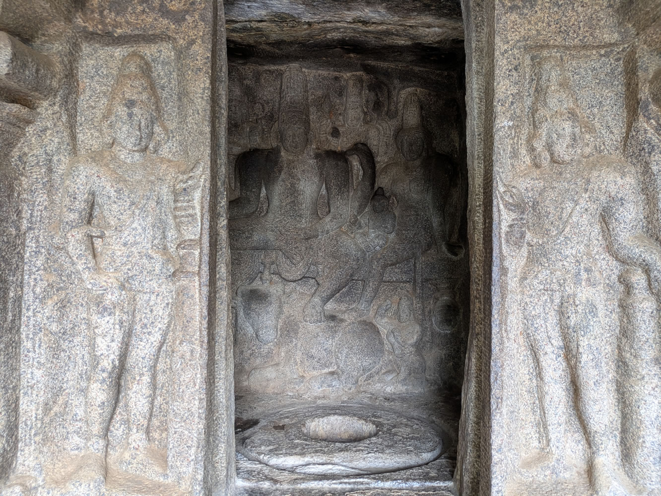 Le Mahishasuramardhini Mandapa date de la fin du VIIe siècle, sous la dynastie Pallava. Ce temple rupestre est situé sur une colline, près d'un phare, parmi d'autres grottes de Mamallapuram. Il présente de nombreux éléments architecturaux remarquables.