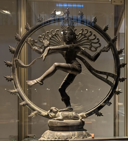 Parmi les aspects de Shiva, la forme dansante de l’anandatandava est la plus populaire dans le sud de l’Inde et se caractérise par : la jambe droite du Dieu placée sur le dos d’un démon appelé muyalakan (tamoul) ou apasmara (personnification sanskrite de l’ignorance) et la jambe gauche levée. La main supérieure droite tient un kettledrum ou udukai (tamoul) et la main supérieure gauche porte un feu, avec des langues de flammes jaillissantes. La main droite inférieure est en abhaya, le corps est encerclé par un serpent tandis que la main gauche inférieure est étendue en forme d’arc. La position connue sous le nom de gaja hasta (main en forme de trompe d’éléphant), ses doigts pointent vers le pied levé qui est représenté penché en arrière. Shiva porte une coiffe de mèches emmêlées (jatāmakula) ornée de plumes de paon et d’une tête de Gangā. Le croissant et le crâne sont également visibles sur ses cheveux. Le mouvement rapide, extatique et violent du tambour est symbolisé par la guirlande en mouvement rapide autour de ses bras. Une flamme est aussi vue dans sa main gauche. Une ankura-vidya, un bijou particulier aux images de Natarāja, est généralement visible sur la jambe droite.