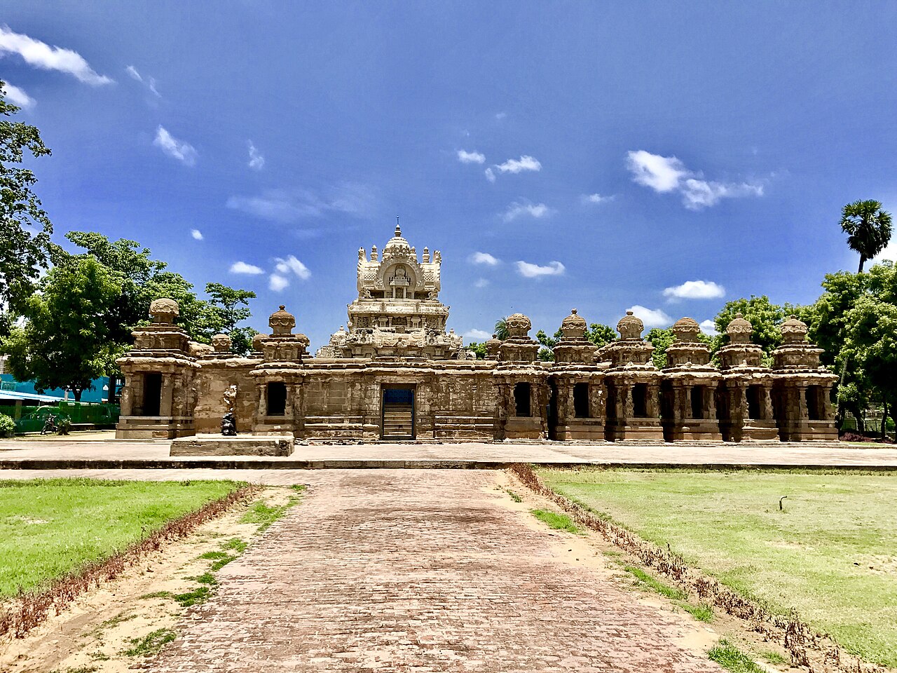 Au centre, la tour-sanctuaire abrite la cella carrée, entourée d'un déambulatoire. Son plan est animé par neuf chapelles hors-œuvre, qui forment autant de ressauts, et son élévation est typique du parti pris d'Inde du Sud, à superstructure pyramidale à faux étages. Initialement, le pavillon hypostyle situé à l'est était séparé de la tour-sanctuaire et était donc ouvert sur les quatre côtés. Le déambulatoire qui assure à présent la jonction entre les deux bâtiments, est une adjonction plus tardive.