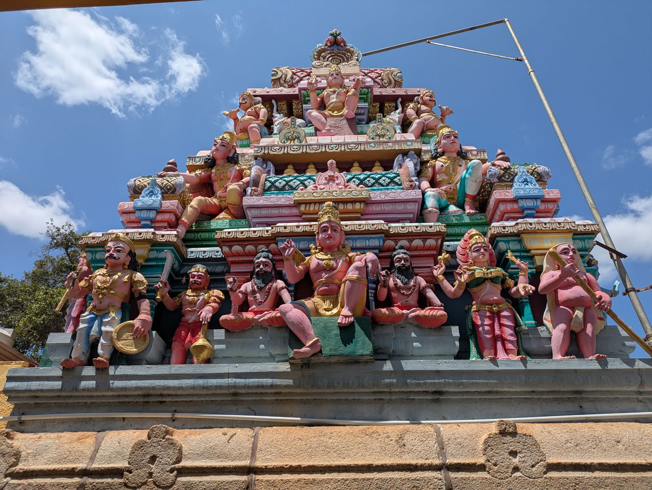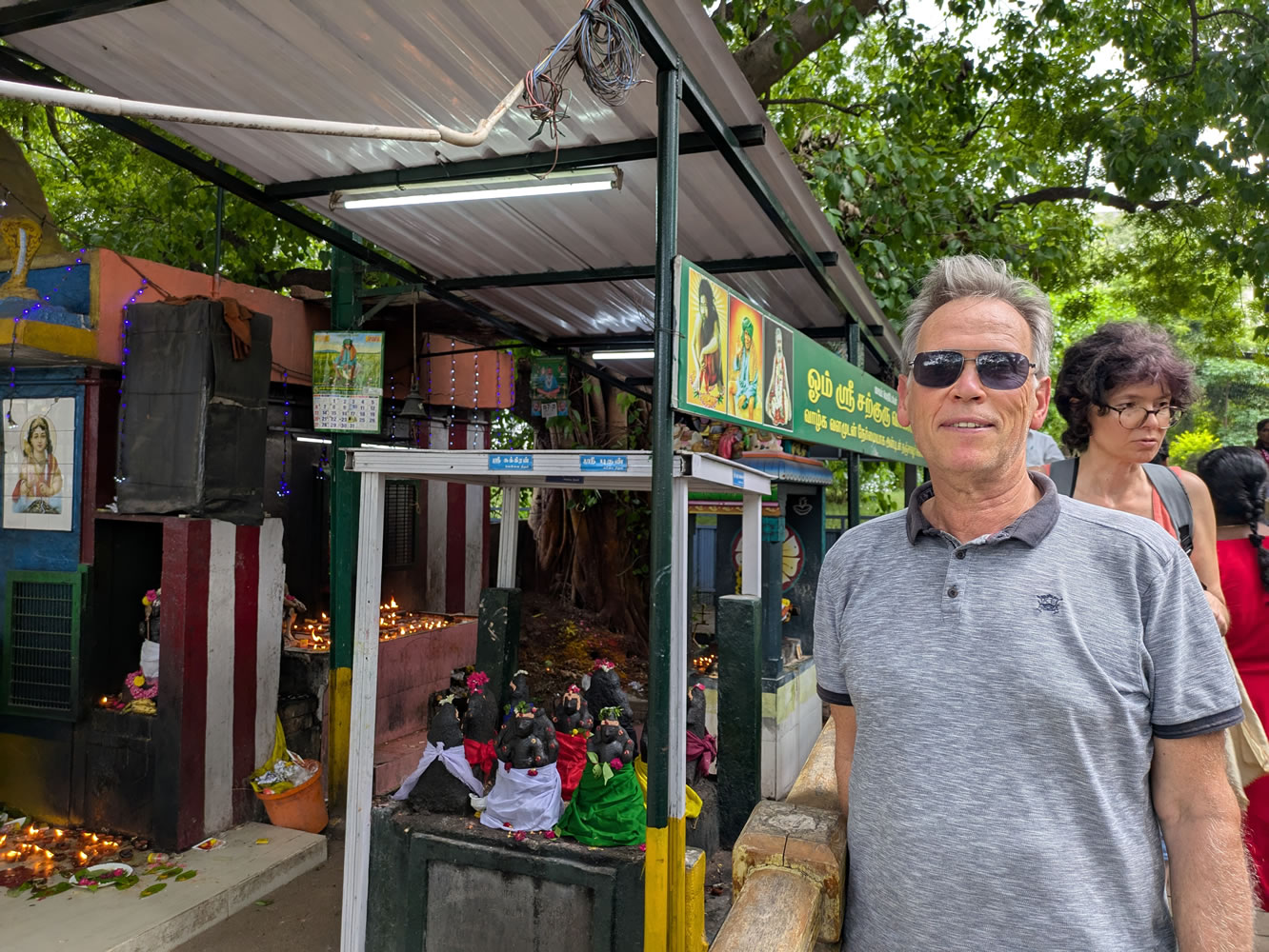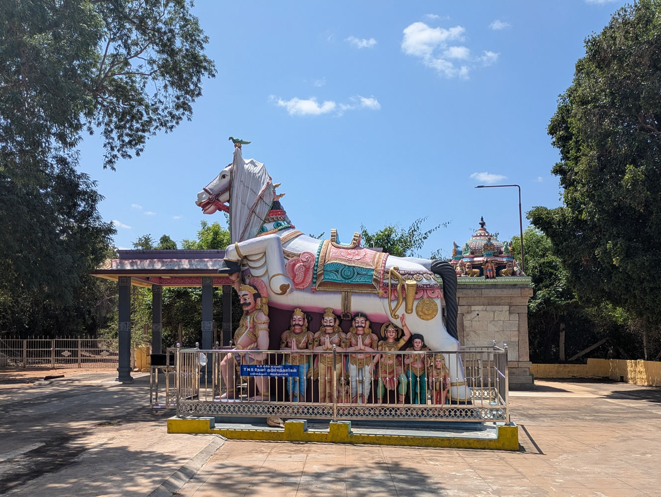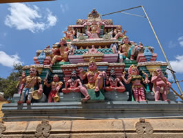 10h30. Apres 1h30 de voiture, arrêt au temple Navagraha à Devipattinam dédié aux Navagrahas, les neuf divinités planétaires. Selon la légende hindoue, les neuf statues en terre des divinités planétaires auraient été érigées par Rama, un avatar de Vishnu.