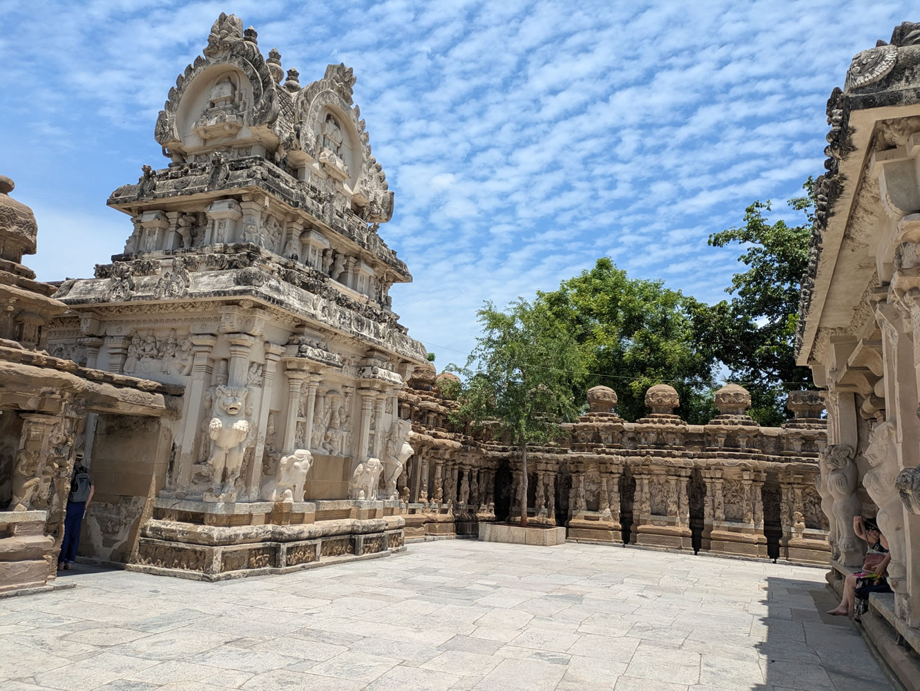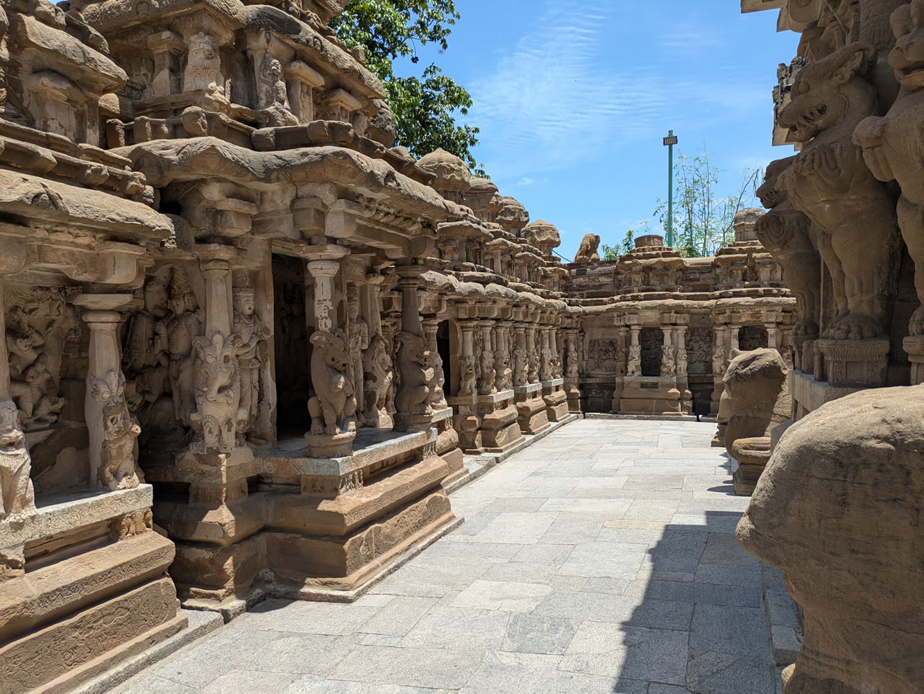 Temple de Kailashnatha. Situé à la lisière de la ville, ce temple dédié à Shiva est, en Inde du Sud, le premier sanctuaire construit et non creusé dans la roche. Le mur d'enceinte est sans doute l'un des plus richement ornés de l'Inde du Sud. Vers l'intérieur, il abrite les quatre côtés, 58 niches, autant de temples en miniature. Comme les chapelles accolées au sanctuaire, elles ouvrent à l'est ou à l'ouest, contre le mur est, le nord et le sud étant considérés comme des directions néfastes. On trouve les premières représentations connues du dieu Ganesha et des septa matrica. Certaines chapelles conservent des vestiges d'une polychromie très ancienne mais qui ne remonte pas à l'époque des Pallavas. Les murs ouest, au centre, sud et nord, dans l'axe latéral du sanctuaire principal présentent des chapelles aux couvertures surélevées avec le toit en berceau. Ce sont les embryons des Gopurams que l'on verra s'élever, toujours plus haut, dans les temples dravidiens les siècles suivants.