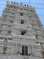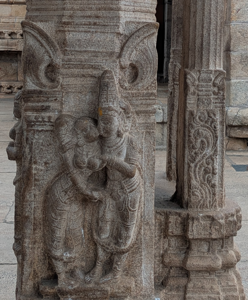 Temple Ekambareswara. C'est le plus vaste et le plus saint des temples de la ville. On y vénère un lingam, façonné par Parvati elle-même, qui avait été reléguée en ce lieu par son époux mécontent. D'origine très ancienne, sans doute intérieure aux Palavas, le temple fut entièrement remodelé par les rois de Vijayanagar, dans les gigantesques proportions que l'on découvre aujourd'hui. L'immense Gopuram de 11 étages, 58 mètres et demi, fut construit au tout début du XVIème sur l'ordre de Krishna Deva Raya, 1509-1529, dont le règne marqua l'apogée du Vijayanagar. C'est l'un des Rayo Gopuram, tour royale, que les souverains de Vajinagar dressèrent dans leur royaume, en témoignage de puissance et de piété. Dans le hall aux mille piliers, les visiteurs scrupuleux, n'en compteront cependant que 540, se déploie un bestiaire fantastique propre au temple de cette époque. Le sanctuaire, interdit aux non-hindous, s'inscrit dans une immense vestibule rythmée de colonnes. Tout près s'élève un ravissant petit temple à Kali, où chacun peut recevoir la bénédiction d'un prêtre. A l'arrière, sous le portique, ouvre une chapelle secondaire, où les fidèles viennent déposer leur offrande en ammoniva shiva natharaja en bronze.