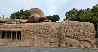 Descente du Gange ou Ascèse d'Arjuna: Bas-relief spectaculaire qui raconte la descente du Gange, qui représente l’histoire mythique du Gange prenant sa source dans l’Himalaya. Ce grand pan de rocher montre une foule d’animaux, de créatures semi-divines et de divinités aquatiques admirant la descente du Gange, représenté par une cascade qui descend de la chevelure de Shiva.