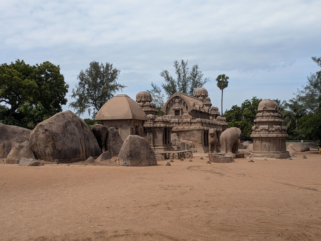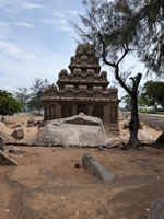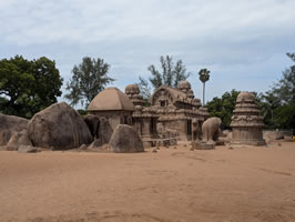 A 200 mètres se trouvent les Five Rathas, ensemble de cinq temples construits en forme de chars. Ils portent le nom d’un des frères Pandava, héros de l’épopée du Mahabarata et sont tous dédiés à une divinité hindoue. Devant chacun des chars, se trouve l’animal qui servait de monture à la divinité honorée.