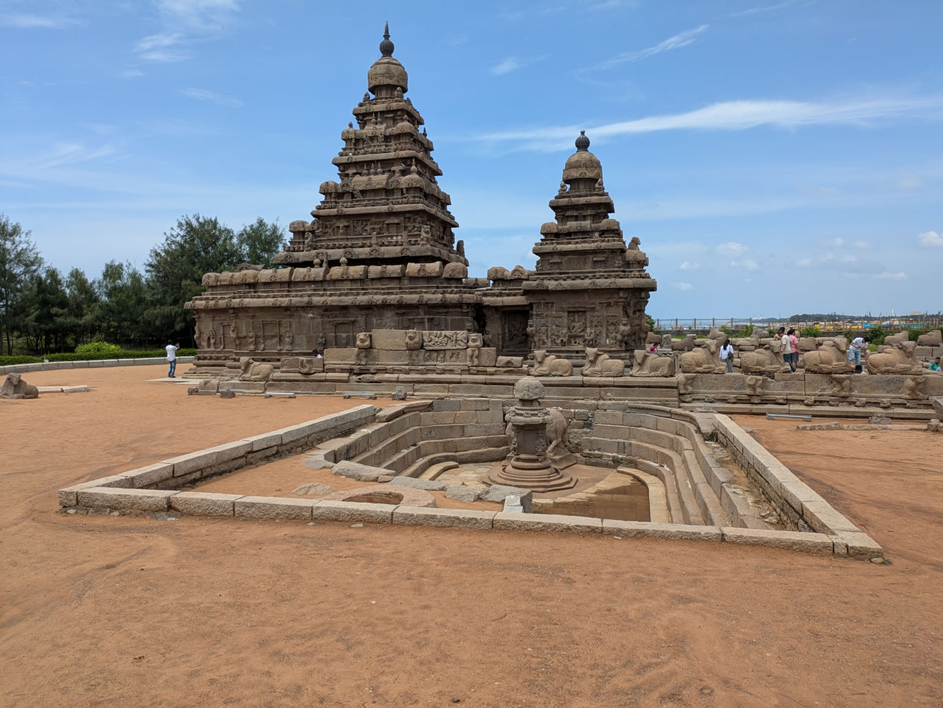 Retour par l'ébauche avant d'atteindre Temple du rivage, l’un des édifices les plus célèbres de l’Inde du Sud, avec ses deux tours face à la mer. Des rangées de Nandi, véhicule personnel de Shiva, entourent le temple.