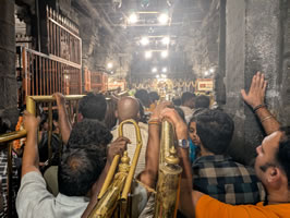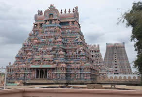 Visite du temple du Nataraja, connu pour ses magnifiques gopuras du XIIè siècle. Après avoir passé le gopura principal, on passe devant le Pavillon du Roi, ouvert les jours de fête, qui protège une vaste salle aux mille piliers. Autour du bassin sacré se trouve également le Pavillon de Danse, que l’on reconnait à sa forme de char aux colonnes sculptées. Vous y admirerez le superbe temple de Nataraja, Shiva en danseur cosmique. C’est l’un des plus beaux temples de l’architecture dravidienne. Les bas-reliefs des porches représentent des positions de la danse bharatanatyam. Cérémonie du soir, à 19h, officiée par les prêtres reconnaissables à leur chignon sur le haut du crâne et au reste du crâne rasé. Les pèlerins qui ont le privilège d'avoir un darshan de Chidambara Ragasiyam, lorsque les prêtres ouvrent le rideau, espèrent voir des feuilles de vilva dorées (Aegle Marmelos) signifiant la présence du Seigneur Shiva et de Parvathi devant eux.