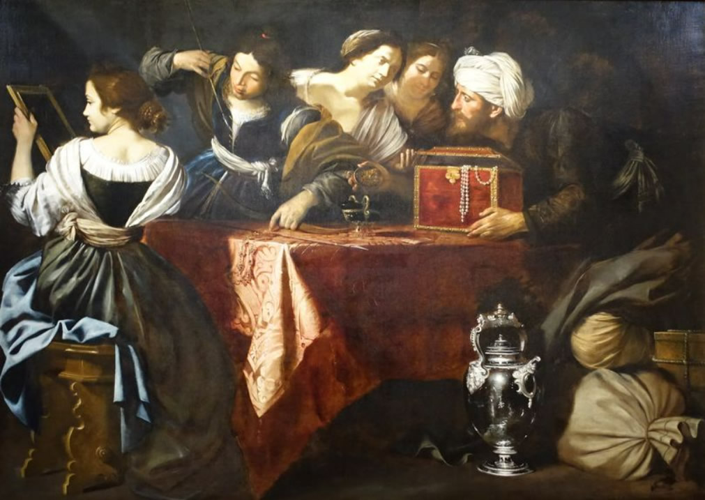 Dans une composition au décor minimaliste, le clair-obscur modèle les visages et les objets. Le format, le thème courtois et l'attention portée à la narration et aux détails suggèrent un commanditaire de haut rang. Cette œuvre ambitieuse et raffinée constitue aussi un hommage stylistique d'Artemisia à son père Orazio, qui rappelle leurs collaborations passées à Rome et à Londres.
