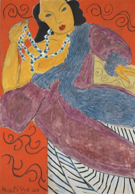 Matisse travailla à L’Asie entre son retour à Vence fin novembre 1945, et son départ pour Paris en juin 1946. L’œuvre fut peinte dans son atelier de la Villa Le Rêve. La surface finement peinte et le dessin fluide confèrent à l'œuvre une apparence de facilité qui masque les efforts minutieux que Matisse a déployés pour sa création. Une photographie conserve une version antérieure de la composition : un cadre noir en bas à gauche, animé de lignes arabesques, et une signature ainsi que la date de 1946 gravées dans la peinture, révélant le fond blanc. Dans sa version finale, Matisse a effacé le cadre au profit d'un rouge flamboyant, unifiant ainsi le fond en un espace décoratif, et a redessiné les lignes arabesques, ainsi que sa signature et la date, au crayon noir. Cette version antérieure de L’Asie, visible sur la photographie, n’était peut-être qu’une des nombreuses révisions effectuées avant qu’il ne parvienne à sa brillante conclusion. Il écrivait en 1948 : « J’ai toujours cherché à dissimuler mes efforts et je souhaitais que mon œuvre ait la légèreté et la joie d’un printemps qui ne laisse jamais deviner le labeur qu’elle a exigé. »