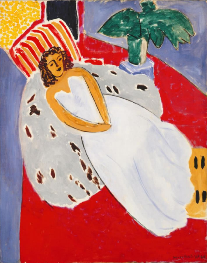 La zone rouge est traversée en diagonale par le modèle allongé. Deux bandes bleues la somment, de part et d’autre. Le reste – les quelques taches noires du manteau doublé de tigre du Tibet, les boucles noires des cheveux, l’emboîtement de triangles qui contient la figure, et le cœur blanc découpé par les bras du modèle et le bustier de sa robe – ne fait qu’ajouter à l’impression d’harmonie exactement ajustée que produit cette toile. Un équilibre proprement matissien, où un principe d’abstraction entre en tension avec un motif figuratif (Matisse face au modèle, comme toujours) au moyen des accords de couleurs les plus vibrants et les plus purs. « L’apparente simplicité » de cette toile parfaite put-elle apparaître à Matisse comme porteuse d’une valeur pédagogique ?