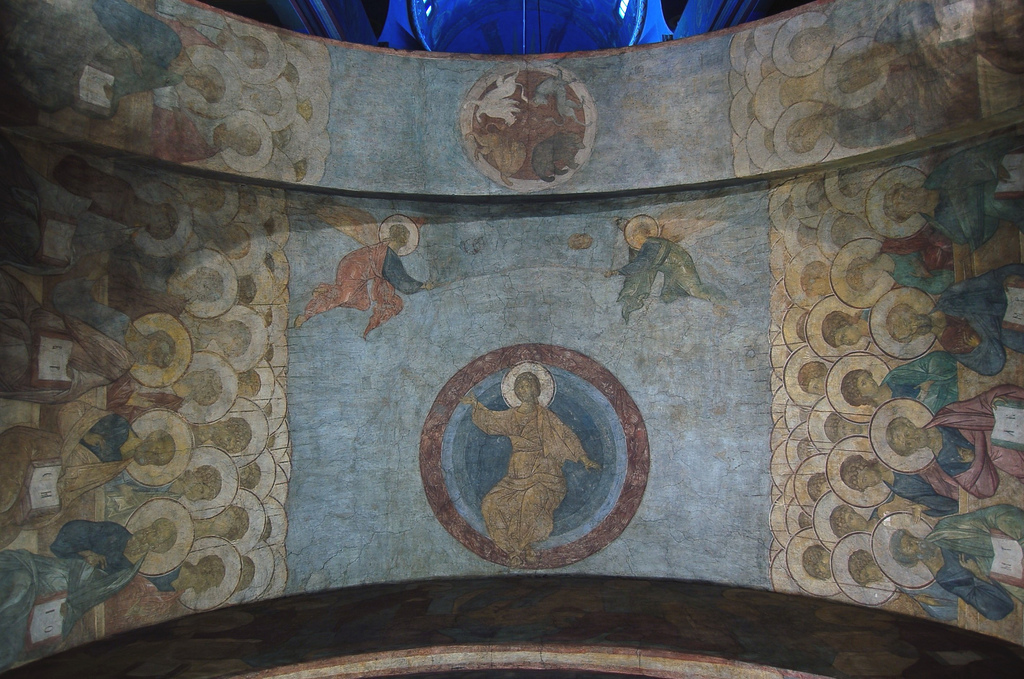Le Christ pantocrator ou en gloire, de la parousie est représenté au sommet de la voûte, le visage entouré d'un nimbe. De sa main droite il désigne les justes et de la gauche les pécheurs. Au-dessus de lui deux séraphins déroulent les livres du ciel. Le livre se présente comme un rouleau de tissu sur lequel sont représentés ensemble : la lune, le soleil et des étoiles, ce qui forme un symbole apocalyptique de la fin des temps sur la terre. Sur l'intérieur de l'arcade suivante les quatre animaux symboles des quatre royaumes qui vont disparaître pour qu'arrive le « royaume du Bien » : celui de Babylone (l'ours), celui de Macédoine (la panthère ailée), celui de Rome (la lionne ailée), et celui de l'Antéchrist sous les traits d'une bête à corne à la queue de serpent.