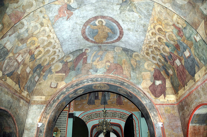 Les assemblées formées au bas des voûtes sont composées d'apôtres au premier rang et derrière eux d'anges. Tous ont les traits sereins et apaisés et baignent dans une atmosphère de couleurs passées. Au lieu d'évoquer les flammes de l'enfer et ses souffrances c'est une joie pascale de la Résurrection qui illumine la scène. Au centre du mur ouest, sous la voûte, est représenté le trône du jugement dernier et, posé devant lui, ses attributs : une croix, une balance et le livre des actions des hommes. Le jour du jugement, c'est ce trône qu'occupera le Christ qui est en face au zénith de la voûte. À côté du trône sont représentés Adam et Ève qui représentent le genre humain, Notre-Dame et Jean le Baptiste. Vers l'extérieur, des anges, et plus bas, le premier des apôtres assis au premier rang de chacune des deux assemblées. La disposition des personnages des apôtres et des anges sur le bas de la courbure de la voûte est similaire à celle utilisée par les auteurs de la fresque située dans la cathédrale Saint-Dimitri voisine. Mais dans cette dernière, les fresques du Jugement dernier datent du XIIe siècle et sont un des seuls éléments subsistant de la décoration intérieure des murs. À propos de l'attribution des œuvres elle se réduit à l'un ou l'autre des deux grands maîtres les plus connus de leurs contemporains : Roublev ou Tcherny. Bien qu'ayant tous deux des techniques et des styles proches les uns des autres, ils ont chacun leur personnalité, leur touche. Le temps a nivelé de nombreuses nuances des fresques originelles : des dégâts, des pertes de parties de fresques, des rénovations hasardeuses ont parfois fait disparaître le « masque » original du visage des personnages et des sujets, rendant très difficile leur attribution par les experts.
