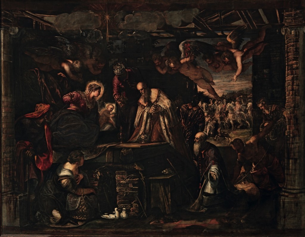 L'imagination débordante du Tintoret situe l'Adoration des Rois mages dans un décor nocturne évocateur : l'étoile brille au-dessus de l'Enfant, tandis que les trois rois s'inclinent devant lui. À l'arrière-plan, leur procession, rendue avec une extraordinaire vigueur visionnaire, rappelle, par son indétermination délibérée, la foule présente au Baptême du Christ dans la salle capitulaire : des figures diaphanes, baignées de lumière et esquissées en quelques coups de pinceau, contrastent avec celles du premier plan, animées et vibrantes par la maîtrise de la lumière du peintre.
