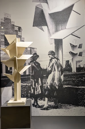 Des mannequins de Sonia Delaunay (1885-1979) portant ses dernières créations en tissus simultanés posent devant les arbres en ciment des sculpteurs Jan (1896-1966) et Joël (1896-1966) Martel, érigés au sein du jardin conçu par Robert Mallet-Stevens pour l'Exposition des arts décoratifs de 1925 à Paris. Cette photographie incarne pleinement ce qu'était l'exposition, et témoigne de la collaboration entre les artistes qui y participent, ainsi qu'entre les grands représentants de l'Art déco. Sonia Delaunay est une figure marquante de cet évènement. Elle présente ses créations, véritables transpositions de ses recherches plastiques sur la couleur et les formes à des tissus ou des objets du quotidien, dans la boutique simultanée qu'elle partage avec Jacques Heim sur le pont Alexandre III.