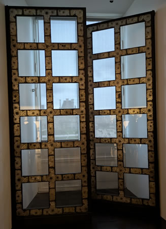 Pour l'Exposition internationale de Paris en 1925, le pavillon Lalique a été dessiné par l'architecte Marc Ducluzeaud. L'entrée est monumentalisée par une grande baie vitrée, avec des portes toutes de verre et de fer. Les formes orthogonales des carreaux aux épais montants métalliques, proches du modernisme, présentent cependant un aspect décoratif par les motifs de chrysanthème en verre incrustés dans le métal. Les jeux de reflets et de transparence animent la géométrie des carreaux et démontrent toute la science de la lumière et de l'ornement de René Lalique, ainsi que son virage moderne.