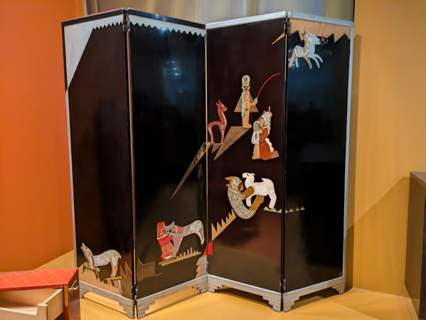 L'Art déco est aussi une histoire de collaborations. L'excellence esthétique des œuvres nécessite souvent l'intervention de plusieurs artistes, experts dans leur domaine, comme pour ce paravent, exécuté par le grand maître de la laque d'après un carton de Jean Lambert-Rucki, peintre dont les silhouettes et animaux sont très reconnaissables. Les deux artistes ont fréquemment travaillé ensemble, notamment pour orner du mobilier de Jacques-Émile Ruhlmann. Dunand collabore également avec Eugène Printz, dont de nombreuses pièces sont laquées. Ce paravent, parfois aussi appelé Rencontres, était présent à l'exposition de 1925 (dans la boutique de Siegel, dans le Pavillon de l'Élégance, ou dans les espaces consacrés à la mode au Grand Palais), œuvre collective de l'Art déco s'il en est.