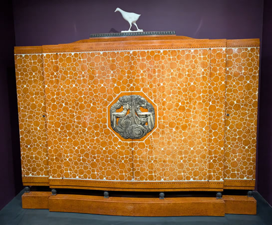 Tout au long de sa carrière, Ruhlmann reçoit des commandes officielles et a meublé les demeures et bureaux de chefs d'entreprise et de capitaines d'industrie. II bénéficie également de grands chantiers, comme le paquebot Île-de-France, la chambre de commerce et d'industrie de Paris, autant de représentations du style français. Exposé au Salon d'automne de 1920 et à l'Exposition internationale des arts décoratifs et industriels modernes de 1925 (dans Une Ambassade française de la Société des artistes décorateurs, surmonté de cette poule d'eau de François Pompon), ce bahut au motif de cailloutis typique de Ruhlmann a été livré au palais de l'Élysée en 1926 et utilisé pendant presque vingt ans.