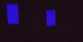 Autre jeu avec la lumière noire et les pigments phosphorescents, cette disposition dans une pièce où la lumière s'éteint toutes les 10 secondes de 1020-seldom (2019) laissant phosphorescent l'ancien cadre blanc du tableau mis dans un alignement en perspective avec 1021-Monochrome violet