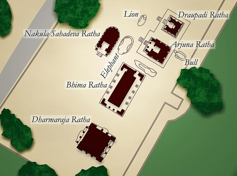 Deux d'entre eux, les ratha de Dharmaraja et d'Arjuna présentent tous les éléments constitutifs du parti dravida, avec superstructure pyramidale à faux étages entourés d'édicules en réduction, le premier, plus grand, comptant, en plus, une seconde cella au niveau supérieur.