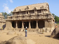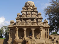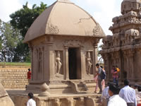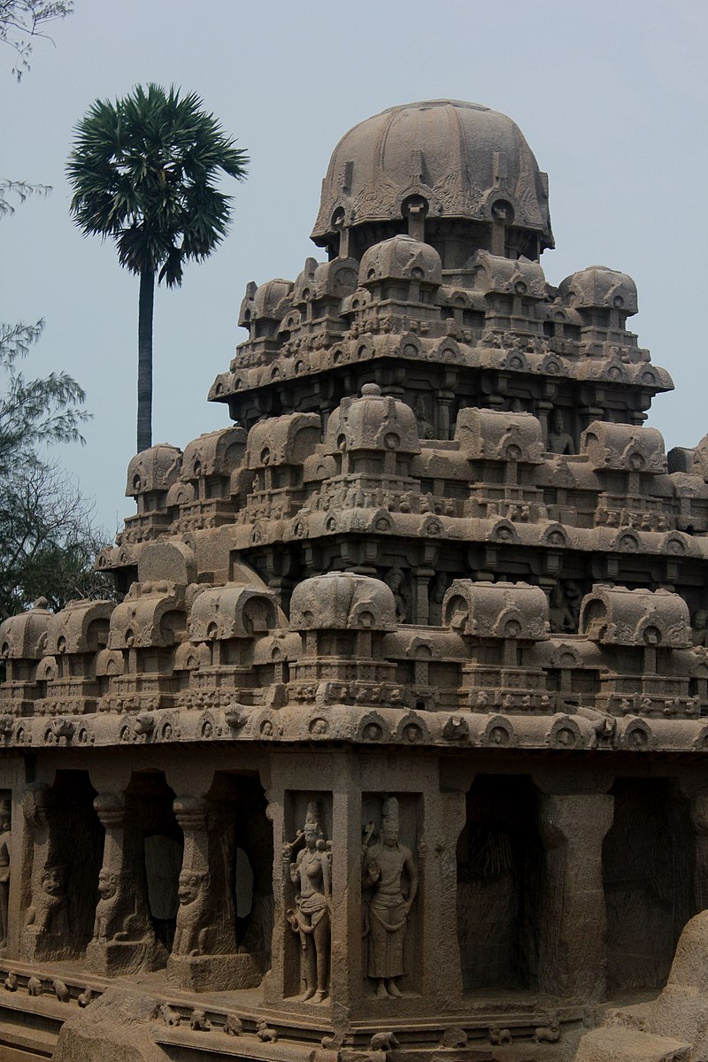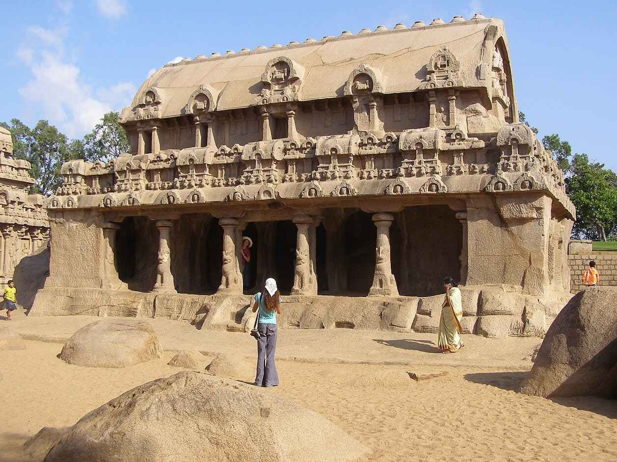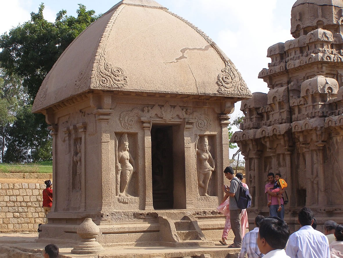 La capitale de la dynastie des Pallava était, nous le savons, Kanchipuram, mais une grande part de leurs fondations religieuses et réalisations artistiques se trouvent dans leur principal port, Mahabalipuram, dont le nom ancien était Mahāmallapuram, d'après un des titres du roi Narasimhavarman It (r. vers 630- 668). On attribue à ce souverain un grand nombre de temples rupestres, c'est- à-dire des grottes, mais aussi un ensemble de cinq sanctuaires qui paraissent construits bien qu'ils soient en réalité entièrement sculptés à partir d'un immense bloc de pierre. Du fait de leur taille relativement réduite, qui les rapproche des chars de procession en bois de la période moderne, ces monuments sont généralement qualifiés de ratha, mais cette appellation désormais usuelle est très tardive et n'a pas de véritable fondement. De même, on les a baptisés du nom des cinq héros du Mahābhārata et de leur épouse commune parce que ces temples sont au nombre de cinq', mais, là encore, cette appellation est tardive et n'a aucun lien avec les divinités auxquelles ces temples étaient consacrés. Bien que taillés dans la pierre, ces temples montrent déjà toutes les caractéristiques de l'architecture construite qui se développera en Inde du Sud.