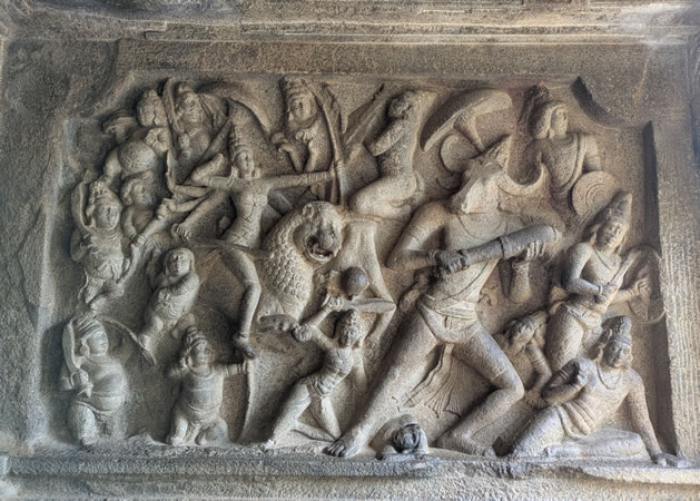 La paroi nord de la grotte présente le bas-relief représentant la scène de bataille entre deux adversaires : la déesse Durga et le démon Mahishasura à tête de buffle. Ce panneau symbolise le triomphe du bien sur le mal. La sculpture est considérée comme l'une des plus belles créations de la période Pallava. Dans cette scène de guerre, Durga apparaît avec huit bras, chevauchant un lion à l'air féroce. Elle tient un khadga (épée), un dhanush (arc), des bana (flèches) et un ghanta (cloche) dans ses quatre mains droites ; ses quatre mains gauches brandissent un pasa, un sankha et un poignard. Une servante tient un chatra (parasol) au-dessus de la tête de Durga. Elle se trouve sur le champ de bataille avec son armée de guerrières et de ganas (nains). Elle est représentée attaquant, à l'aide de flèches, le démon Mahisha, le forçant à battre en retraite avec ses suivants.