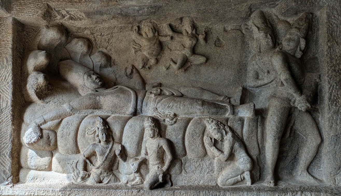 Sur la face sud de la grotte se trouve un panneau représentant Vishnu Anantasayana. Madhu et Kaitabha, les deux démons, sont sculptés près des pieds de Vishnu, en position d'attaque, armés d'une gada (masse). Les démons sont en retraite, tandis qu'Ananta, sifflant et crachant des flammes les attaque. Vishnu, imperturbable, caresse Ananta pour l'apaiser. Le panneau représente également deux ganas (nains). Ces nains sont les ayudhapurushas (armes personnifiées) de Vishnu ; le gana masculin est appelé Shanka, et le gana féminin, la massue de Vishnu. L'autre scène du panneau, située en bas, montre trois figures : son chakra (disque) sous sa forme d'ayudha-purusha, Khadga (l'épée de Vishnu) à droite, et la figure féminine, Bhudevi.[10] Cette sculpture illustre la légende du Bhagavata Purana, selon laquelle, lors de la création, les asuras Madhu et Kaitabha dérobèrent les Védas à Brahma et les déposèrent au plus profond des eaux de l'océan primordial. Vishnu était le seul dieu capable de sauver les Védas. Aussi, voulurent-ils l'attaquer. Sesha, furieux, cracha des flammes jaillissant de ses capuchons et se jeta sur les démons. Maha Vishnu apaisa Sesha et prit l'avatar Hayagriva. Il tua les démons et rapporta les Védas à Brahma. En conséquence, Vishnu reçut les surnoms de Madhusudana – le vainqueur de Madhu – et de Kaitabhajit – le vainqueur de Kaitabha. Les corps de Madhu et de Kaitabha se désintégrèrent en 2 x 6, soit douze morceaux (deux têtes, deux torses, quatre bras et quatre jambes). Ces morceaux sont considérés comme représentant les douze plaques sismiques de la Terre.