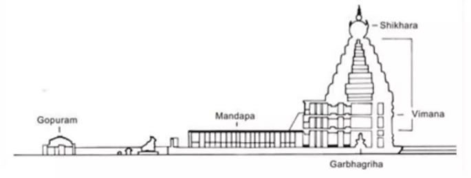 Le temple de style dravidien est entouré d'une enceinte, possède un Gopuram , portail d'entrée au centre du mur d'enceinte. Le Vimana est la forme de la tour principale du temple. Il s'agit d'une pyramide à degrés qui s'élève géométriquement (contrairement au Shikhara de style Nagara, qui est incurvé). Dans le style dravidien, shikhara désigne l'élément de couronnement au sommet du temple. À l'entrée du garbhagriha, des sculptures de féroces dvarapalas gardaient le temple.