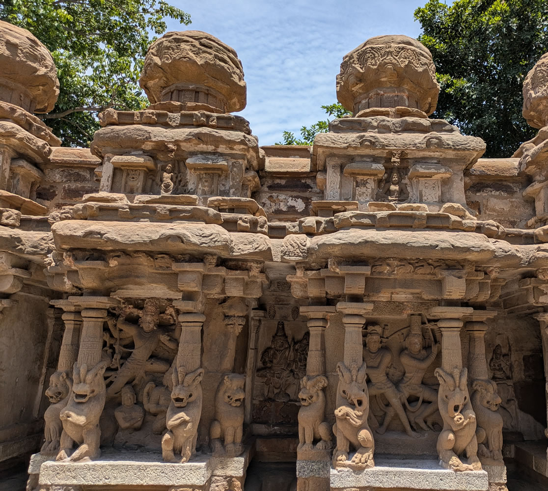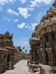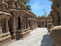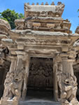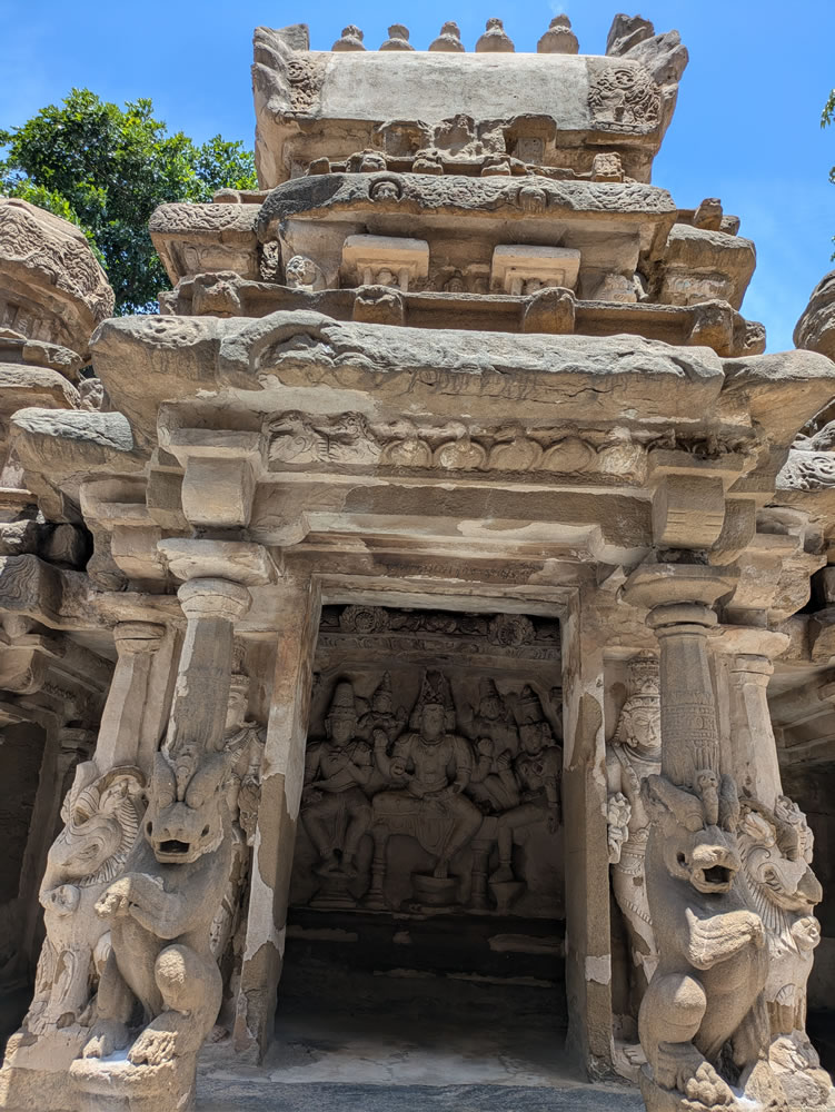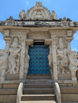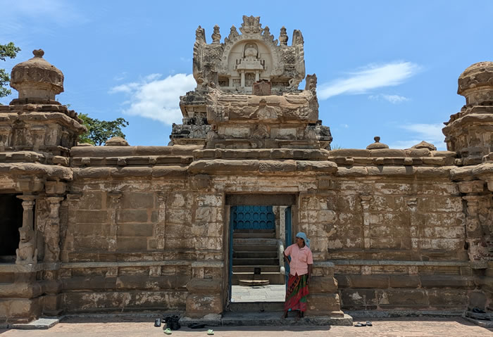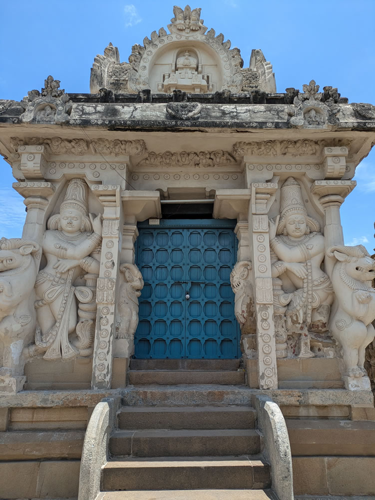 Après avoir franchi les huit premiers sanctuaires, on est face à la chapelle appelée Mahendreśvara temple. Une porte en bois bleu bordée de deux sculptures géantes de Shiva. Elles se distinguent par leur taille et leur couleur blanche avec à leurs pieds les lions Pallava, que l'on voit partout à Kanchipuram est fermée