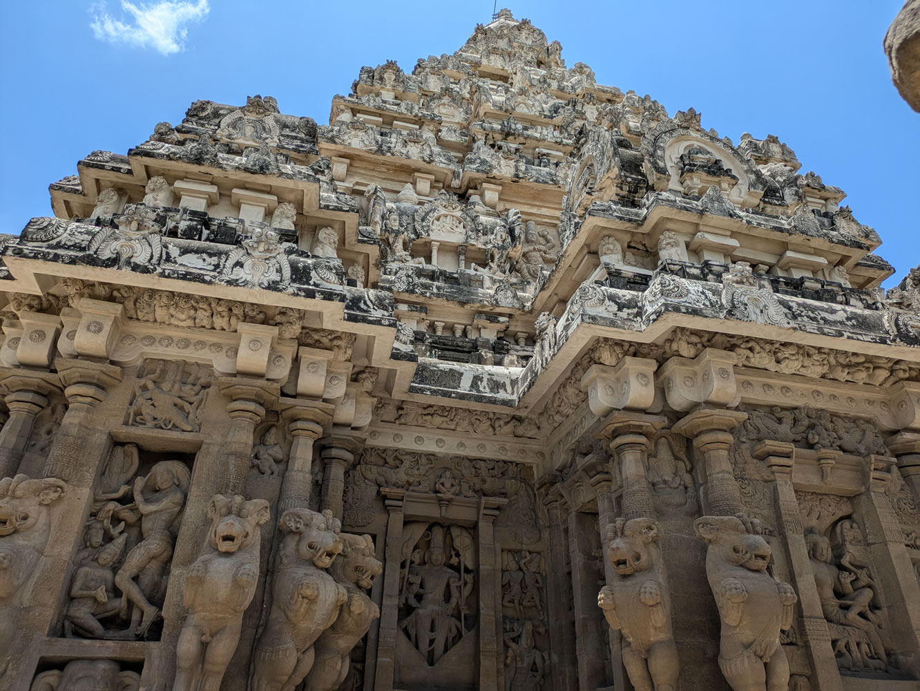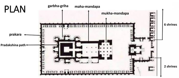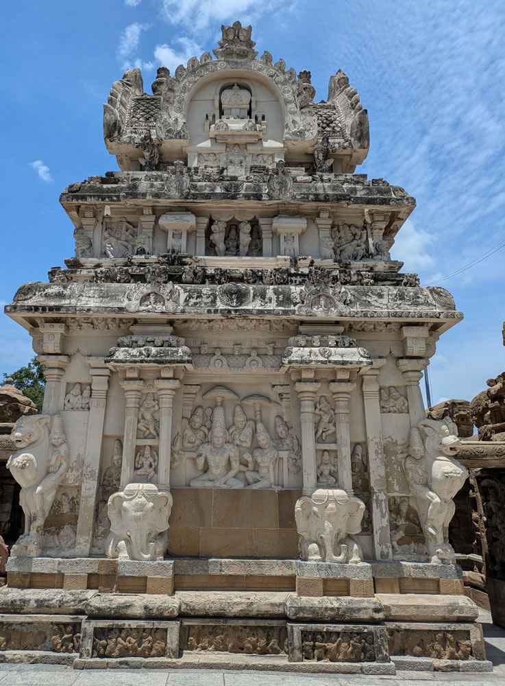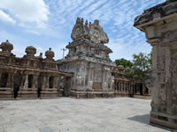 Au centre, la tour-sanctuaire abrite la cella carrée, entourée d'un déambulatoire. Son plan est animé par neuf chapelles hors-œuvre, qui forment autant de ressauts, et son élévation est typique du parti pris d'Inde du Sud, à superstructure pyramidale à faux étages. Initialement, le pavillon hypostyle situé à l'est était séparé de la tour-sanctuaire et était donc ouvert sur les quatre côtés. Le déambulatoire qui assure à présent la jonction entre les deux bâtiments, est une adjonction plus tardive.