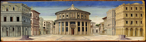 Construite autour d'une perspective à point de fuite central, occulté par une rotonde ou un tempietto, percée d'une porte entrouverte, la représentation est purement architecturale sans présence humaine. Les bâtiments latéraux, des habitations de style Renaissance alignées par le point de fuite, possèdent tous des fenêtres, des galeries à arcades au sol, des loggias en terrasse. Deux margelles de puits ou de réservoir complètent le tableau sur un sol carrelé de motifs géométriques Les frontons des deux bâtiments du premier plan portent des inscriptions indéchiffrables semblant mélanger inscriptions latines et grecques.