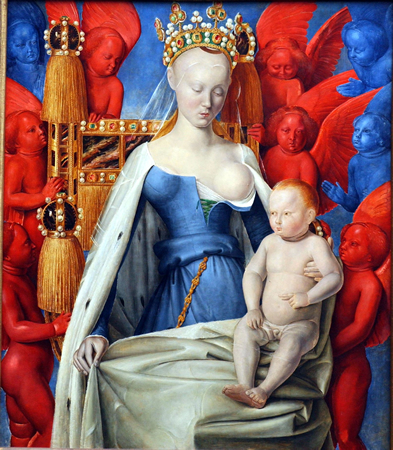 Fouquet a choisi de peindre la Vierge, Mère du Christ, en divine souveraine. Marie se tient parfaitement immobile sur son trône. Mais peut-être est-elle debout.