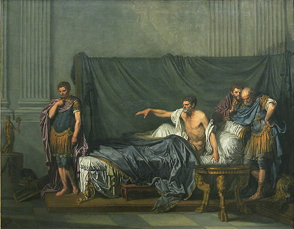 Dans un intérieur avec pilastres et tenture, l'empereur, torse nu, assis dans un lit, montre du doigt Caracalla debout au pied du lit. Deux hommes s'entretiennent à son chevet.