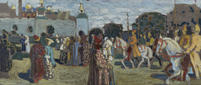 À l’époque du Jugendstil, l’Art nouveau allemand, Kandinsky avait créé, entre 1901 et 1903, une école d’art à Munich, rattachée à son groupe, Phalanx. Les thèmes petits-russiens sont l’adaptation de l’Art and Craft de William Morris à l’originalité de l’art populaire russe, en lutte contre l’occidentalisation du pays voulue par les tsars. Ils illustrent également la rivalité entre deux métropoles, Saint-Pétersbourg et Moscou. Kandinsky, lui, est moscovite de cœur.