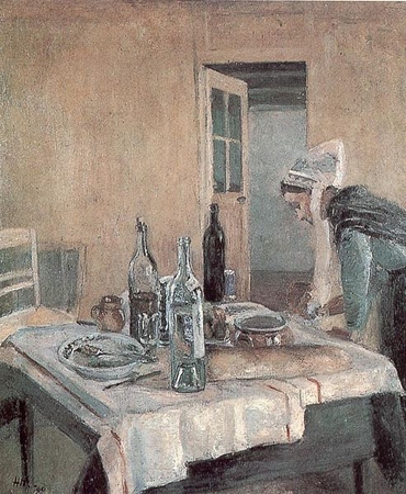 Cette nature morte sera son dernier hommage aux maîtres hollandais et à Chardin Une serveuse se penche au-dessus d’une table recouverte d’une nappe froissée sur laquelle reposent du pain, du vin et des fruits Nous sommes dans un café rudimentaire près de la grotte de l’Apothicairerie. Le tableau rend les détails caractéristiques : tablier noir de Clotilde, coiffe en triangle ornée de rubans (modèle du Palais), trois bouteilles de vin ouvertes sur la modeste table (on buvait du vin à volonté chez le patron, le père Huchet). En dépit de son réalisme à la flamande la toile montre déja le flot de lumière, les surfaces nues lumineuses, l’assouplissement des tons et de la texture