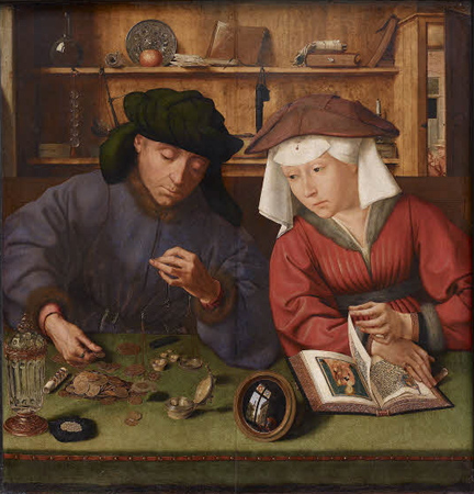 Le tableau est aujourd'hui plus volontiers nommé le peseur d'or et sa femme mais aussi prêteur et sa femme ou même Le changeur d'argent et sa femme. La ville d'Anvers connaît à cette époque une activité commerciale considérable et devient rapidement le principal lieu d'échange entre le Nord et le Sud. On y croise des marchands portugais et espagnols ainsi que les puissants banquiers italiens. Cette activité frénétique fait de la ville le centre financier le plus important d'Europe. La conséquence de la présence d'une communauté internationale de marchands utilisant diverses monnaies est l'ouverture de nombreuses boutiques de changeurs et de prêteurs dans les lieux les plus fréquentés par les étrangers, comme Bruges et surtout Anvers.