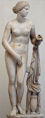 L'Aphrodite de Cnide (ville grecque de l'Asie Mineure située au nord de l'île de Rhodes) est l'une des uvres les plus célèbres de Praxitèle (IVe siècle avant JC). Elle est la première représentation connue de la nudité féminine complète dans la grande statuaire grecque. A partir de l'époque romaine, elle est souvent désignée comme la Vénus Pudica en raison de la couverture de son aine avec sa main droite.