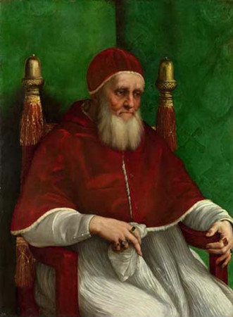 L'image peut être datée par la barbe de Jules, qu'il avait laissé pousser comme une marque de mortification à avoir perdu la ville de Bologne en 1511 et avait rasé en mars 1512. Il devait mourir à 70 ans l'année suivante. Un homme cholérique et actif, beaucoup critiqué pendant son turbulent pontifient pour mener personnellement ses troupes dans des campagnes militaires laborieuses, il est aussi immédiatement - que dans la main gauche - aristocratique puissant représenté la main droite - et méditatif. Le portrait est de chaque manière digne d'un patron unique dans l'histoire de l'art, un pape discernant et assez chanceux pour avoir été servi par trois des plus grands artistes de la Renaissance élevée - l'architecte Bramante, Michaël Angelo et Raphael.