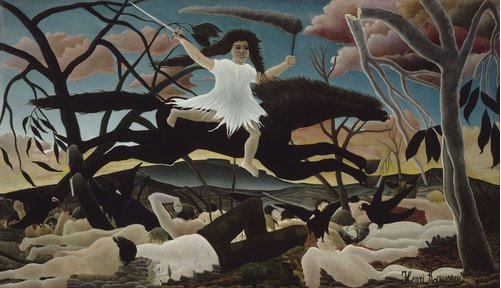 lus de vingt ans après le conflit franco-prussien de 1870 et la Commune de 1871, c'est encore marqué par ces évènements que le Douanier Rousseau peintLa Guerre. Au centre, un personnage féminin grimaçant tient une épée et une torche. Cette sorte de Bellone, déesse romaine de la guerre, monte un cheval qui ressemble plutôt à un monstre hybride. Le sol sombre est recouvert d'un amas de corps, des corbeaux se repaissent de cette charogne humaine. Les arbres semblent calcinés. Les nuages sont rouges. Sans élément anecdotique ou narratif, Rousseau parvient à mettre le drame en image. L'abondance des formes déchiquetées et surtout le choix des couleurs y concourent : le vert de l'espérance est totalement absent ; dominent le noir et le rouge, couleurs du deuil et du sang. Parmi les sources possibles de La Guerre, un emprunt semble évident. Il s'agit de la posture du cheval, sorte de "galop volant", qui correspond exactement à celle des chevaux du Derby d'Epsomde Géricault (1821, Paris, musée du Louvre). Pourtant, grâce à la décomposition du mouvement par la photographie, on sait à l'époque de Rousseau que cette position est fausse et n'intervient jamais dans lors du galop d'un cheval. La Nuit d'Hodler peut également être citée. Dans ce tableau, exposé avec un grand retentissement au Salon des Artistes Français de 1891, les corps allongés parallèlement au plan de la toile, la gamme colorée et la présence de la Mort au centre de la composition sont autant d'éléments qui auraient pu être suggérés à Rousseau par Hodler. Au Salon de Indépendants de 1894, La Guerre est accueillie soit par des sarcasmes, à cause de son aspect maladroit, soit avec enthousiasme, pour sa totale indépendance de style. Ainsi, le jeune peintre Louis Roy écrit dans Le Mercure de France : "cette manifestation a pu paraître étrange parce qu'elle n'évoquait aucune idée de chose déjà vue. N'est-ce point là une qualité maîtresse? [Rousseau] a le mérite, rare aujourd'hui, d'être absolument personnel. Il tend vers un art nouveau...".