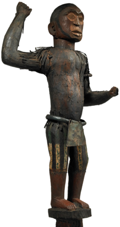 Cette statue pourrait représenter le roi Ghézo, identifiable grâce aux lames de fer qui recouvrent son corps. Elles évoquent le plumage de l'oiseau cardinal, un des symboles de Ghézo. Le pieu sur lequel la statue est posée indique qu’elle était plantée et protégée sous un abri.