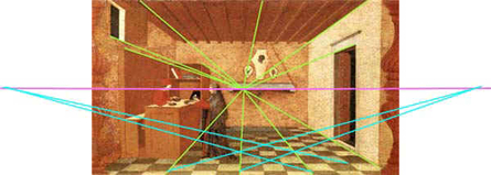 Les images de toutes les perpendiculaires au tableau concourent au point de fuite principal. Les diagonales du carrelage donnent les points de distance.